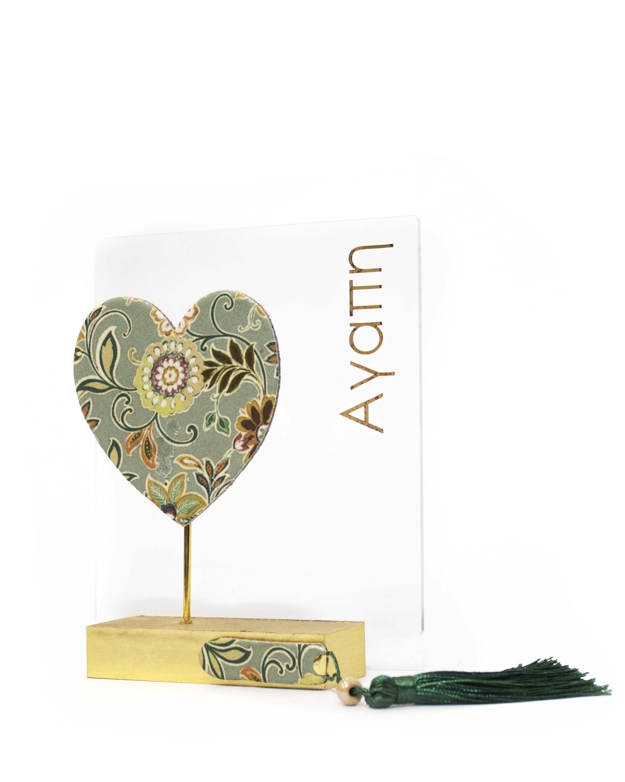Χειροποίητο γούρι 2026 με υφασμάτινη καρδιά σε ξύλινη βάση και πλάτη απο plexiglass  με ευχή ΄΄αγάπη΄΄