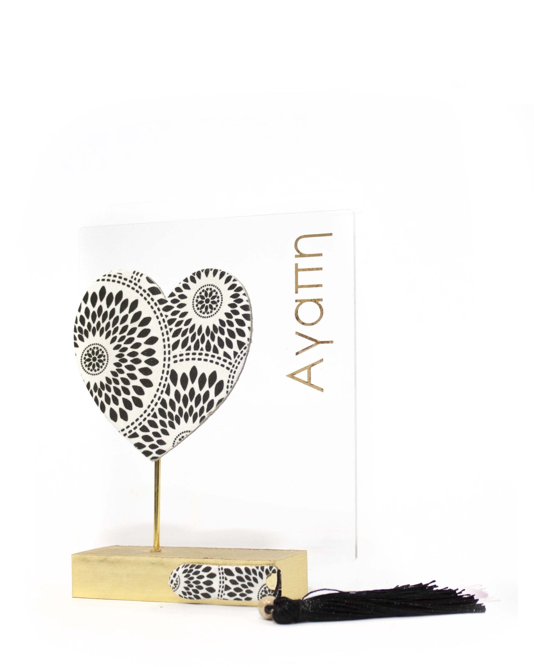 Χειροποίητο γούρι 2026 με υφασμάτινη καρδιά σε ξύλινη βάση και πλάτη απο plexiglass με ευχή ΄΄αγάπη΄΄