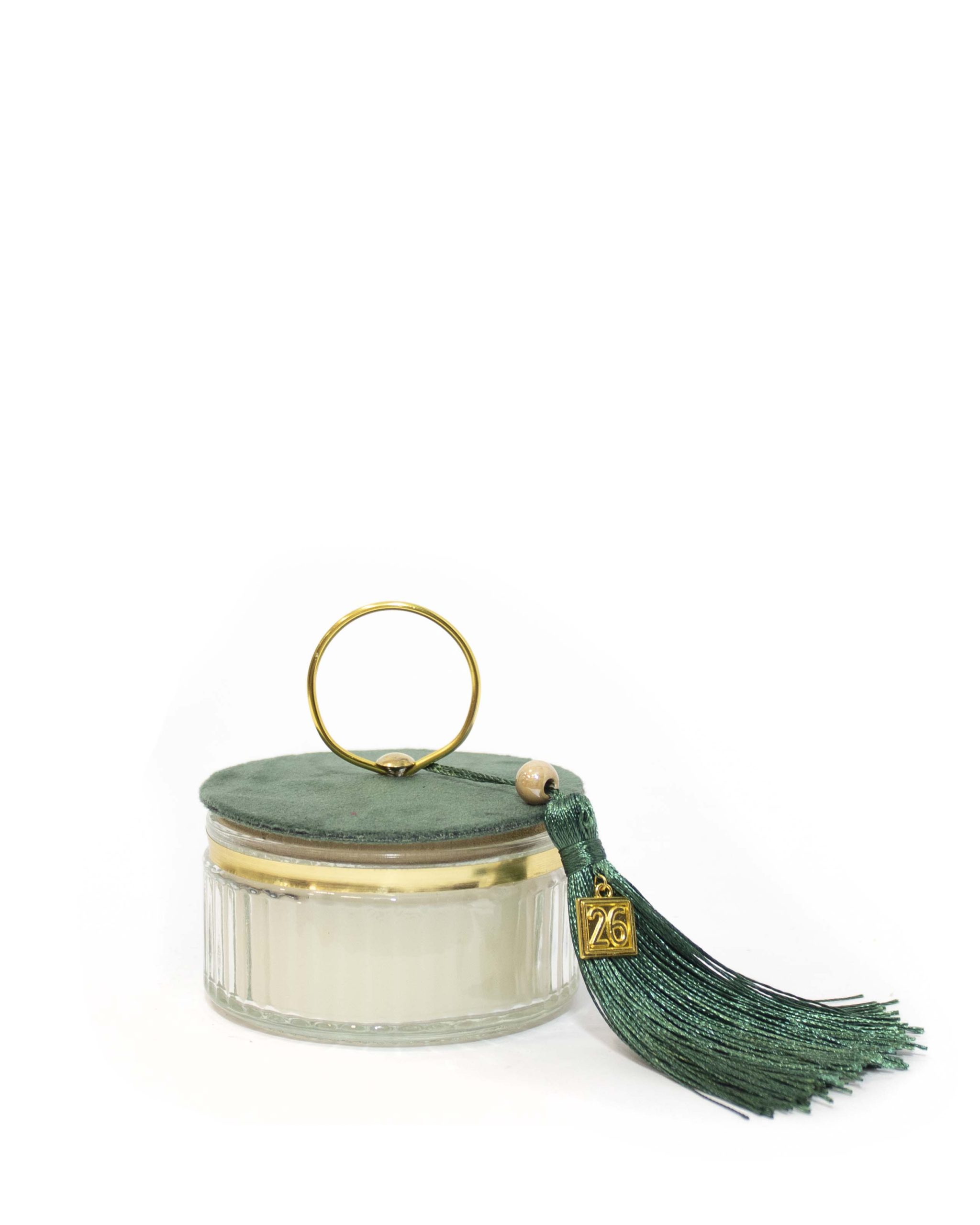 Αρωματικό κερί- γούρι σε γυάλινο βάζο με βελούδινο καπάκι, διακοσμημένο με φούντα και στοιχείο 26