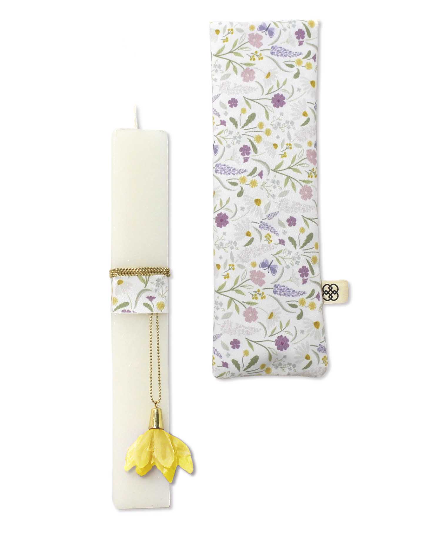 Χειροποίητη πασχαλινή λαμπάδα πλακέ με επίχρυσο κόσμημα υφασμάτινο λουλούδι σε ασορτί υφασμάτινο πουγκί.