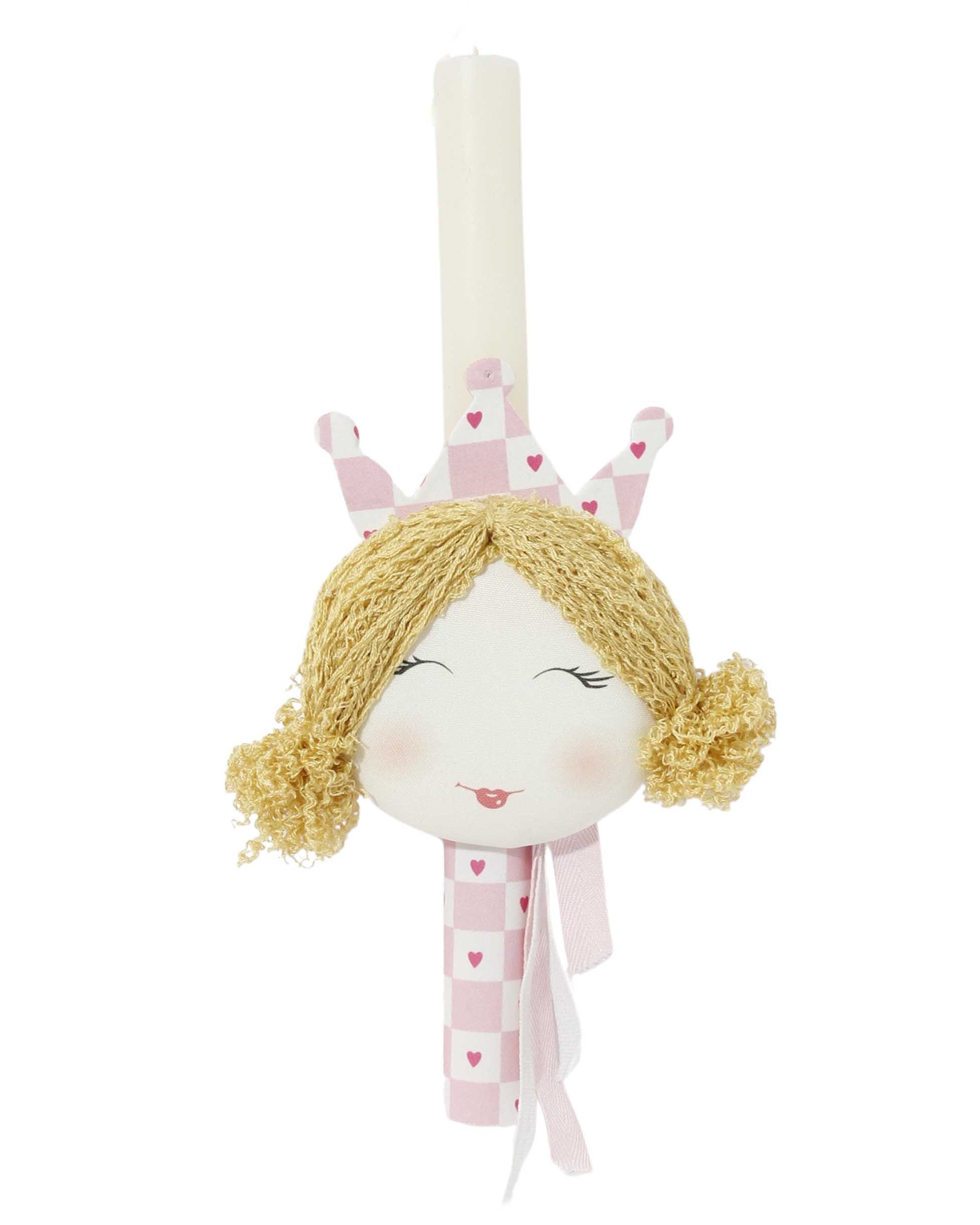Πασχαλινή λαμπάδα με χειροποίητo υφασμάτινο κοριτσάκι με κορωνα