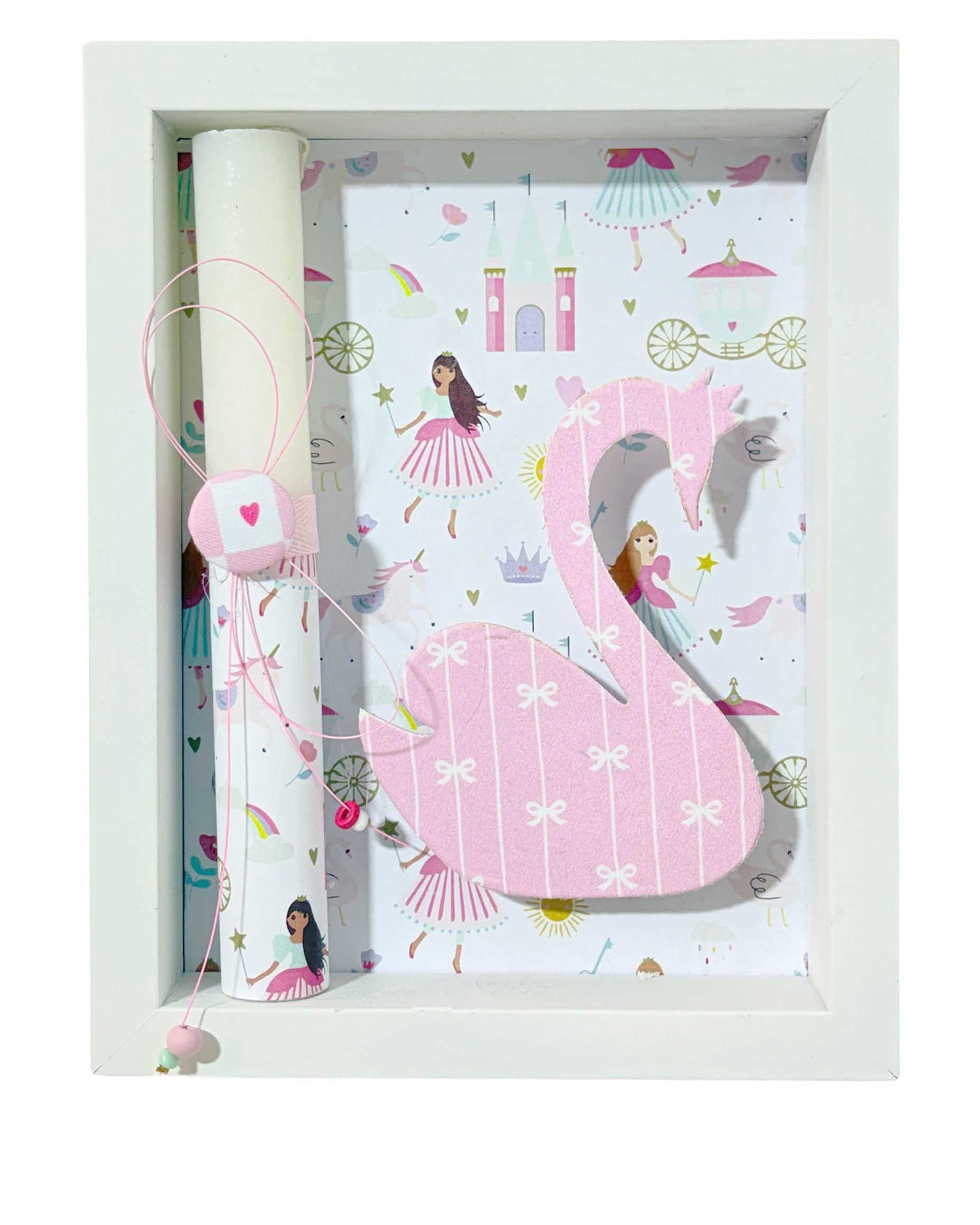 Πασχαλινό Σετ: Λαμπάδα σε χειροποίητο ξύλινο καδράκι με παραμυθένιο θέμα και κύκνο (επιτοίχιο και επιτραπέζιο)