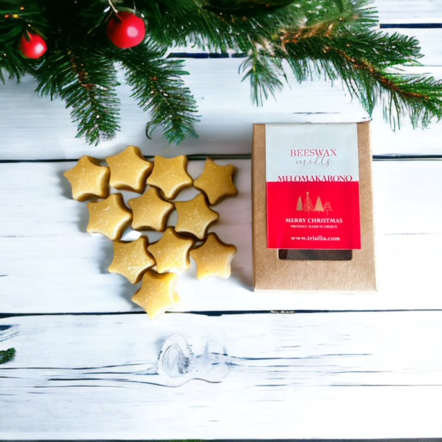 Wax melts σε σχήμα αστεριών, από μελισσοκέρι με άρωμα μελομακάρονο. Αρκεί να τοποθετήσετε ένα ή δύο αστεράκια (ανάλογα με την ένταση που επιθυμείτε) στον αρωματιστή και να μοσχομυρίσει το σπίτι σας με το άρωμα του μελομακάρονου. Το κάθε σετ περιέχει 12 αστεράκια wax melts με το ίδιο άρωμα.